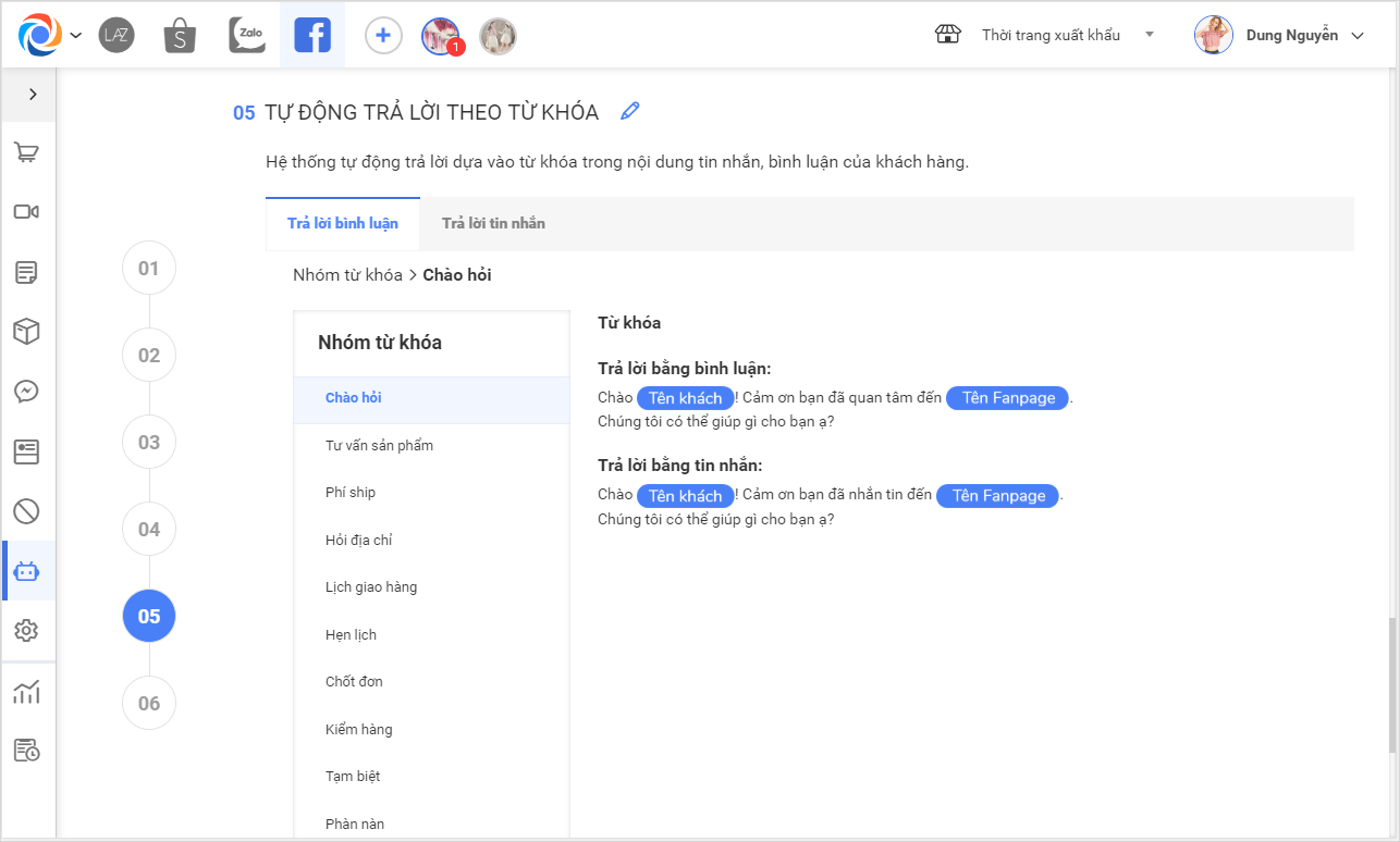 3.5 Tự động trả lời theo từ khóa– Chương trình đang tự động mang đi các từ khóa với các câu trả lời ứng với từng từ khóa trong TH khách hàng bình luận hoặc nhắn tin đến page, tương tự như câu trả lời mặc định khi khách hàng bình luận đến sẽ có các sự lựa chọn là trả lời bằng bình luận, trả lời bằng tin nhắn hoặc trả lời bằng cả bình luận và tin nhắn; khách hàng nhắn tin đến sẽ nhận được tin nhắn tự động theo đúng thiết lập