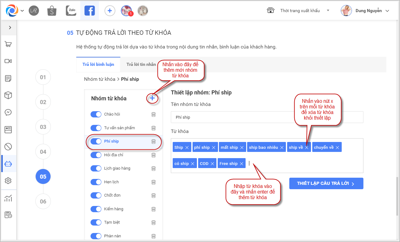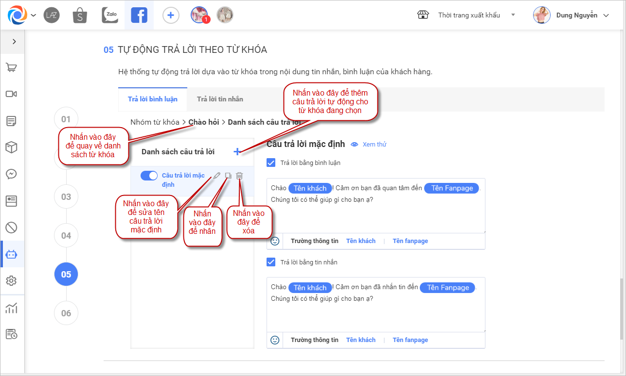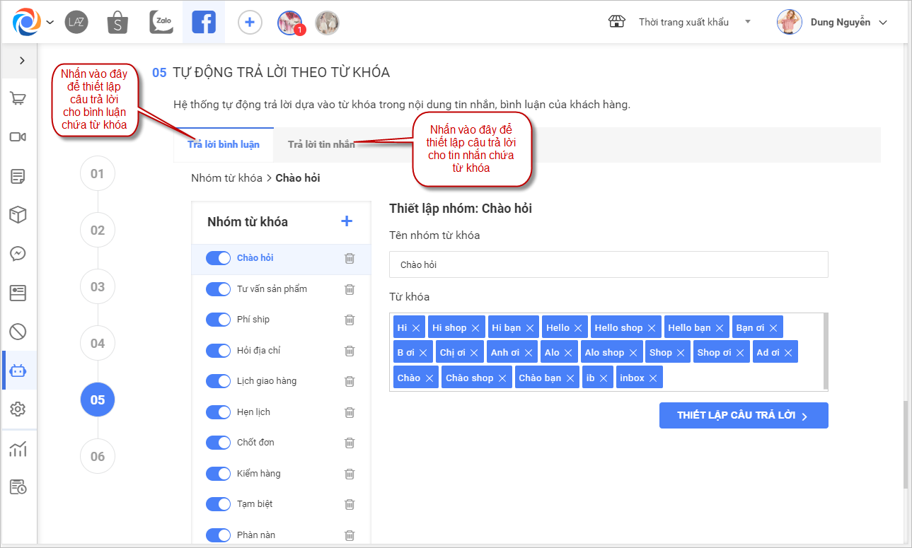– Nhấn vào thiết lập câu trả lời để sửa hoặc thêm các câu trả lời tự động cho mỗi nhóm từ khóa