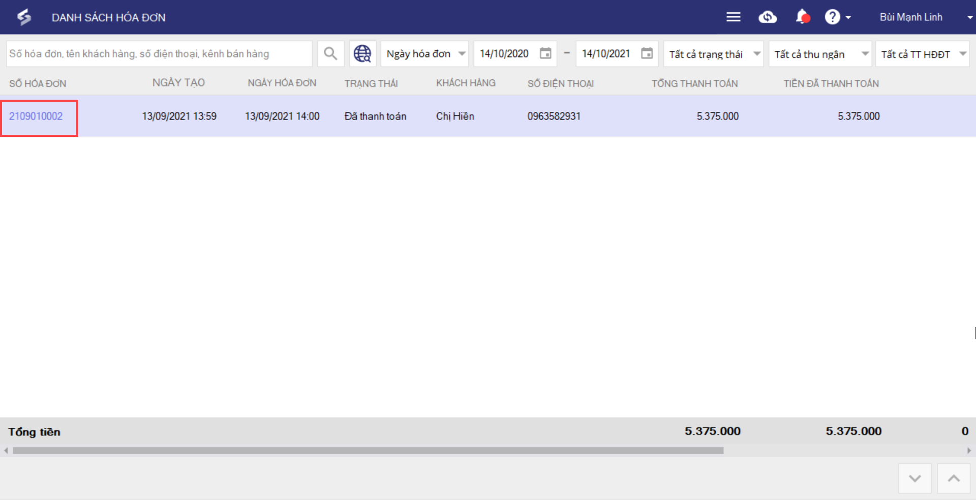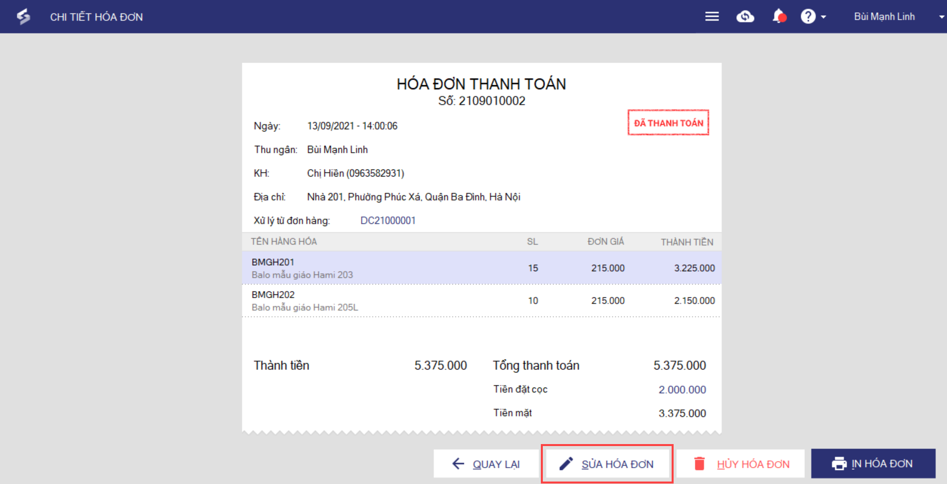 Trong quá trình làm việc, thu ngân có thể lập sai hóa đơn cho khách. Để chỉnh sửa lại, thực hiện như sau: