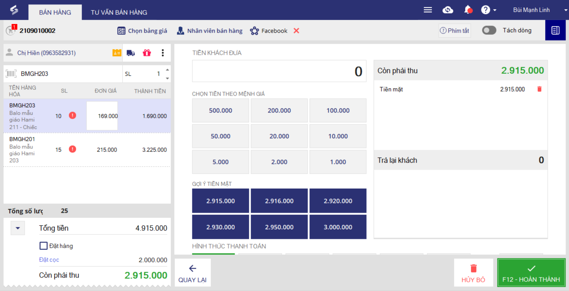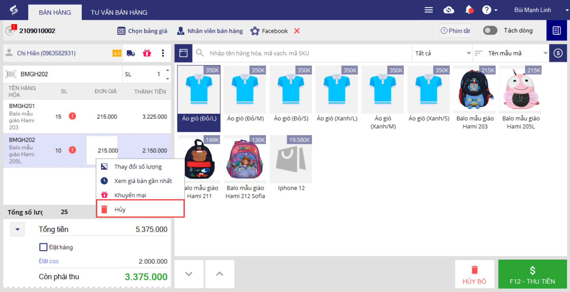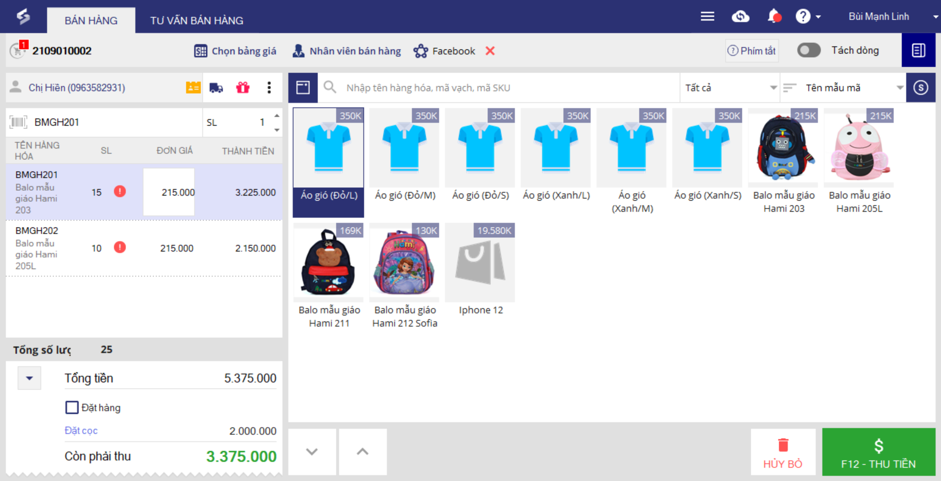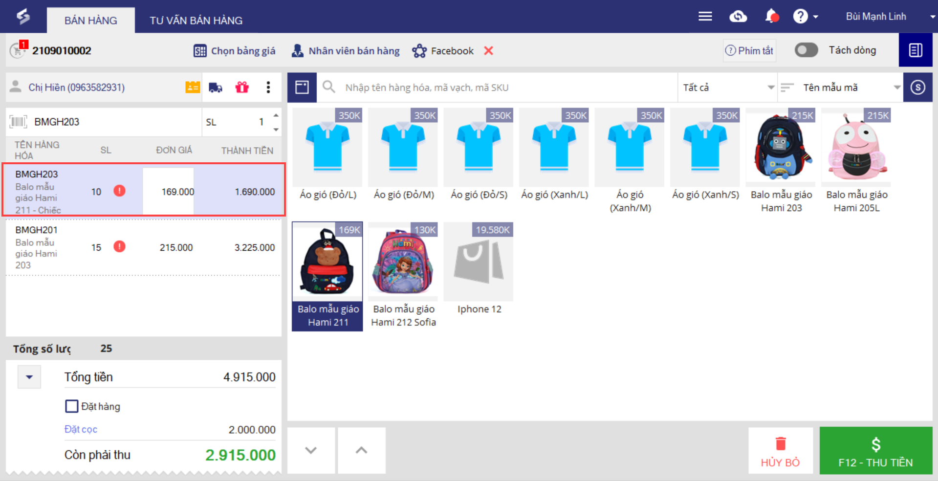 Ví dụ: Khách mua 10 chiếc Balo mẫu giáo Hami 211 nhưng thu ngân chọn nhầm sang mẫu Balo lô mẫu giáo Hami 205 . Khi đó, thu ngân thực hiện: