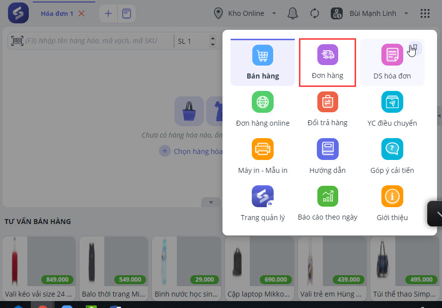 Bước 1: Tại màn hình bán hàng trên web, vào Danh mục, chọn Đơn hàng.