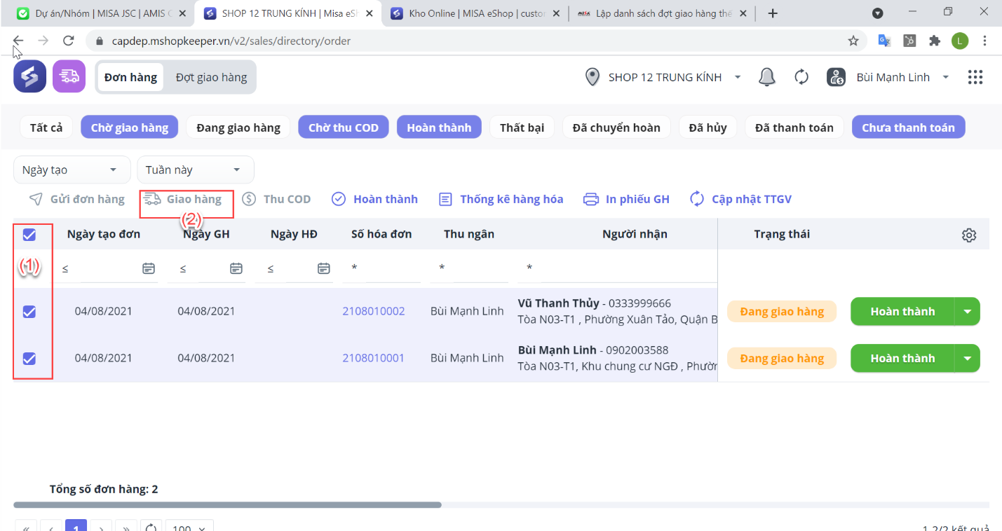 Bước 2: Trên danh sách Đơn hàng chọn các Hóa đơn cần giao (1).