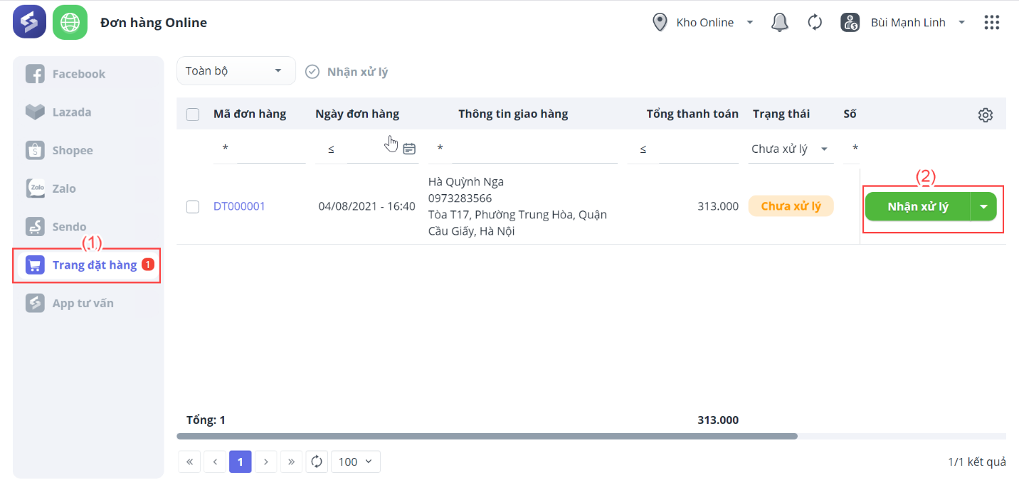 Bước 2: Chọn Trang đặt hàng (1) sau đó chọn Nhận xử lý (2) để xử lý đơn hàng