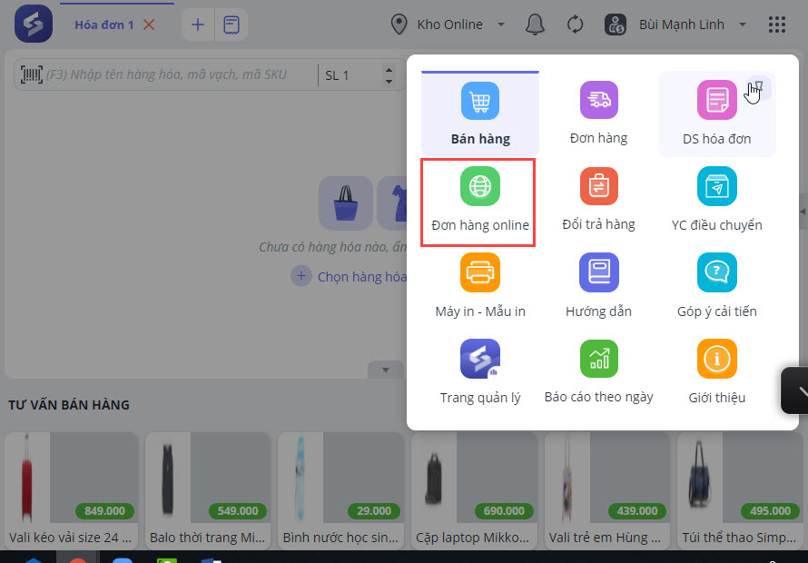 Bước 1: Tại màn hình bán hàng trên web, vào Danh mục, chọn Đơn hàng Online.