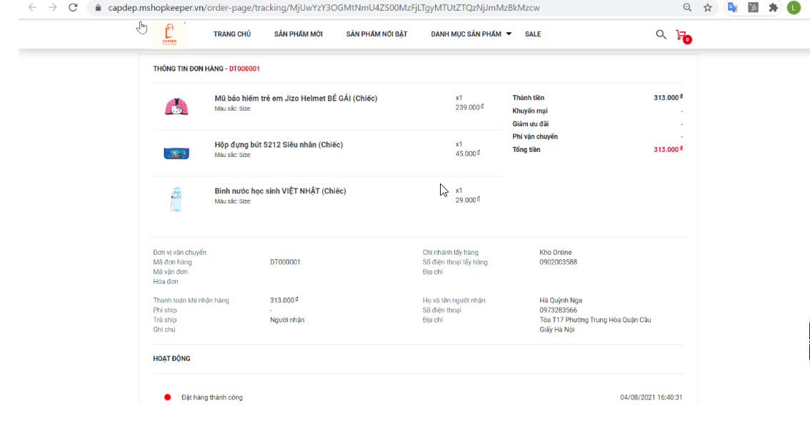 Ví dụ: Sau khi khách đặt hàng thành công trên Trang đặt hàng