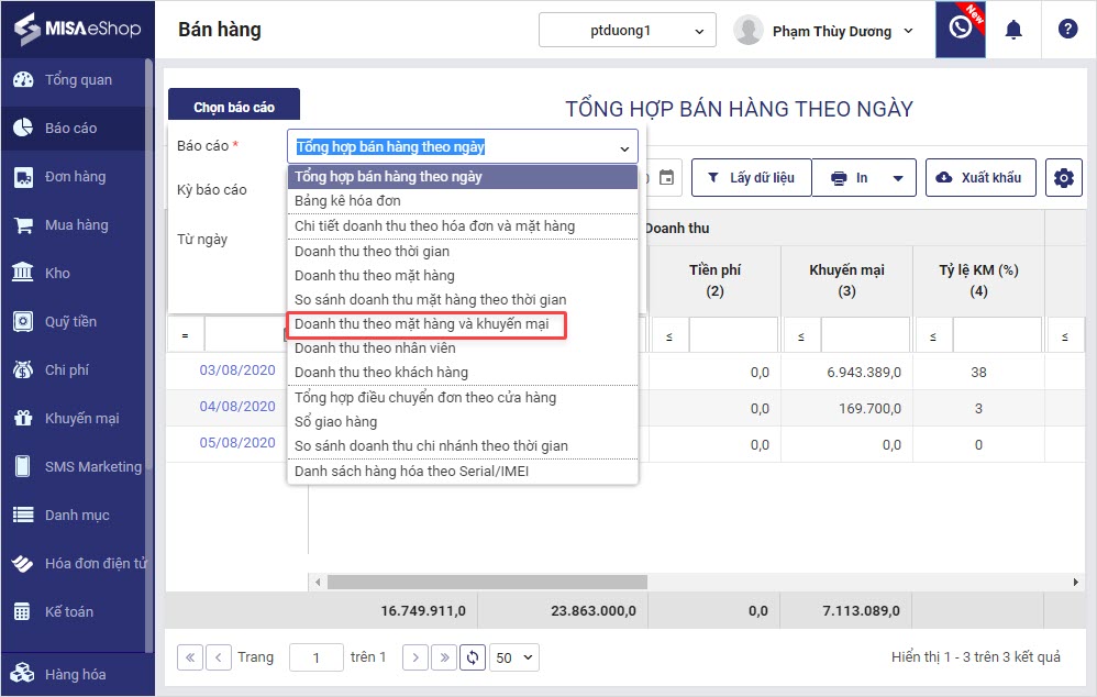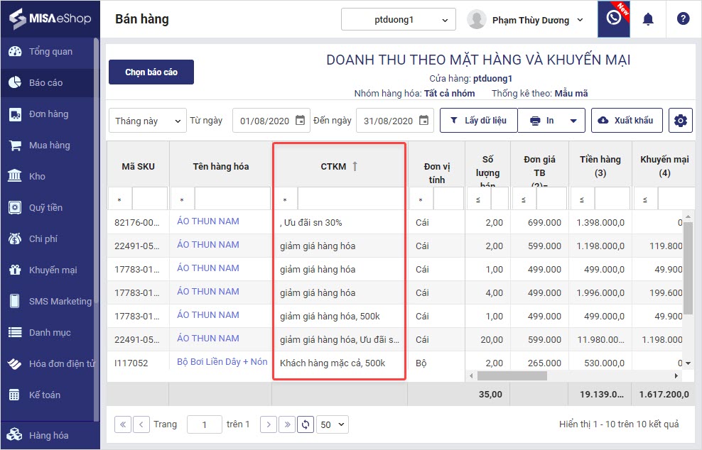Trên báo cáo doanh thu, quản lý theo dõi chương trình khuyến mại áp dụng cho từng hàng hóa tại cột CTKM.