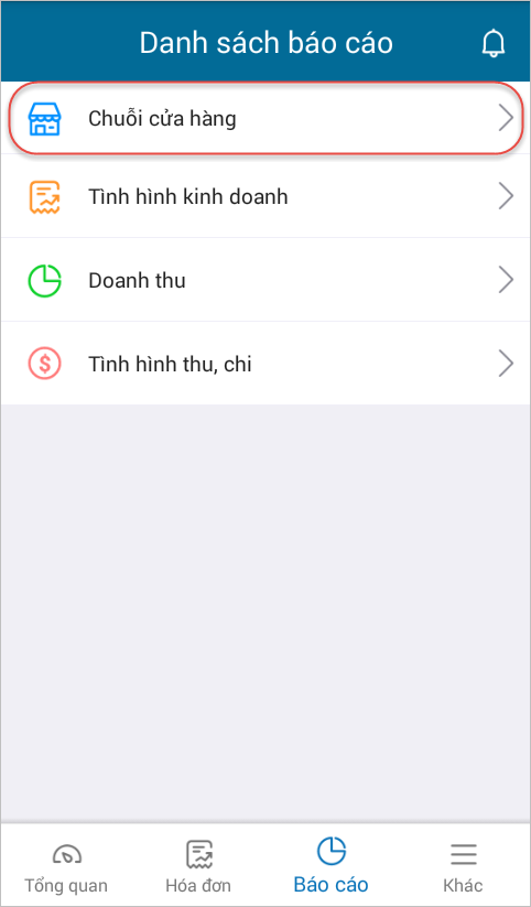 - Nhấn chọn tab Báo cáo/Chuỗi cửa hàng.