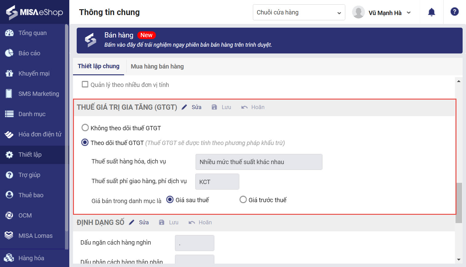 - Chỉ có thể thay đổi giá bán là giá sau thuế hoặc trước thuế khi cửa hàng chưa phát sinh doanh thu