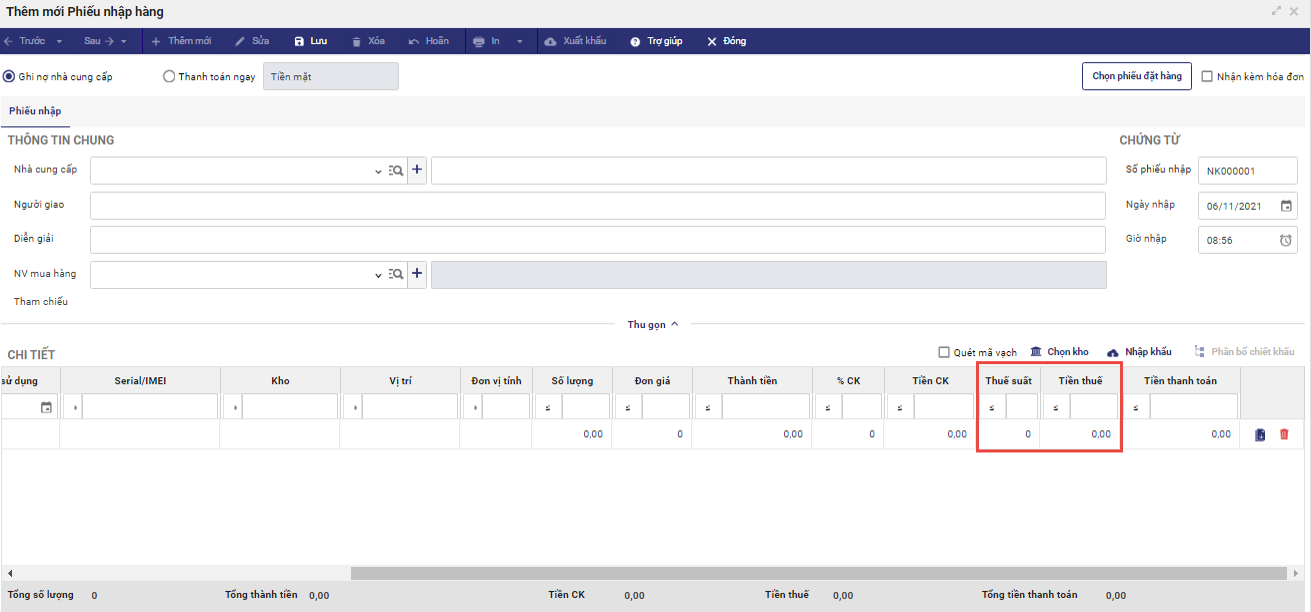 - Khi mua hàng, kế toán nhập thông tin thuế suất và tiền thuế vào trường tương ứng.