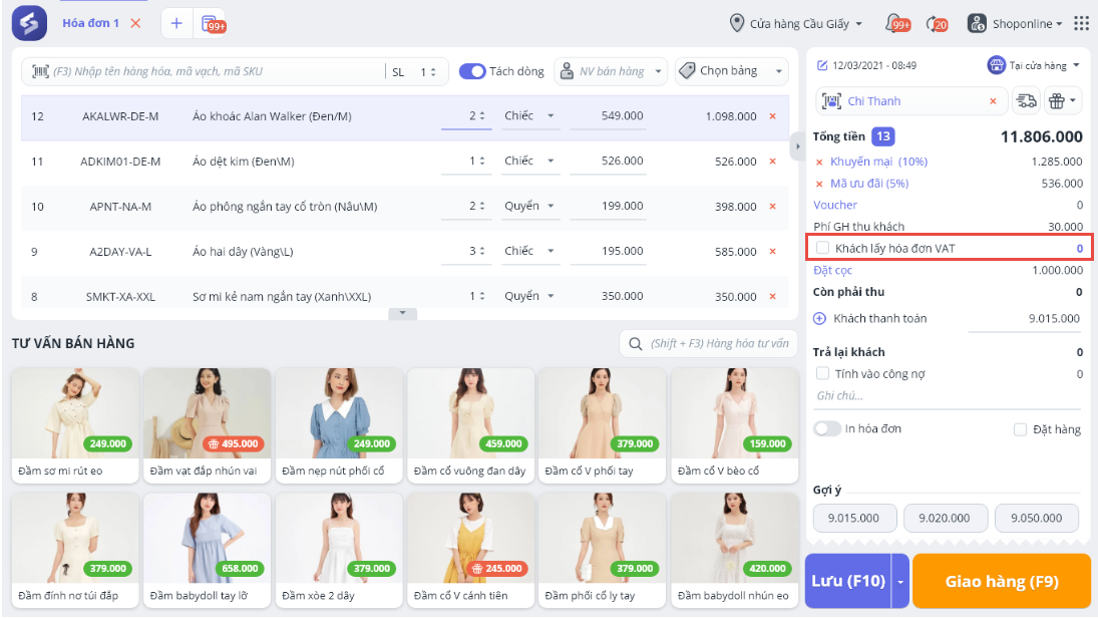- Giao diện bán hàng có thêm tích chọn: Khách lấy hóa đơn VAT