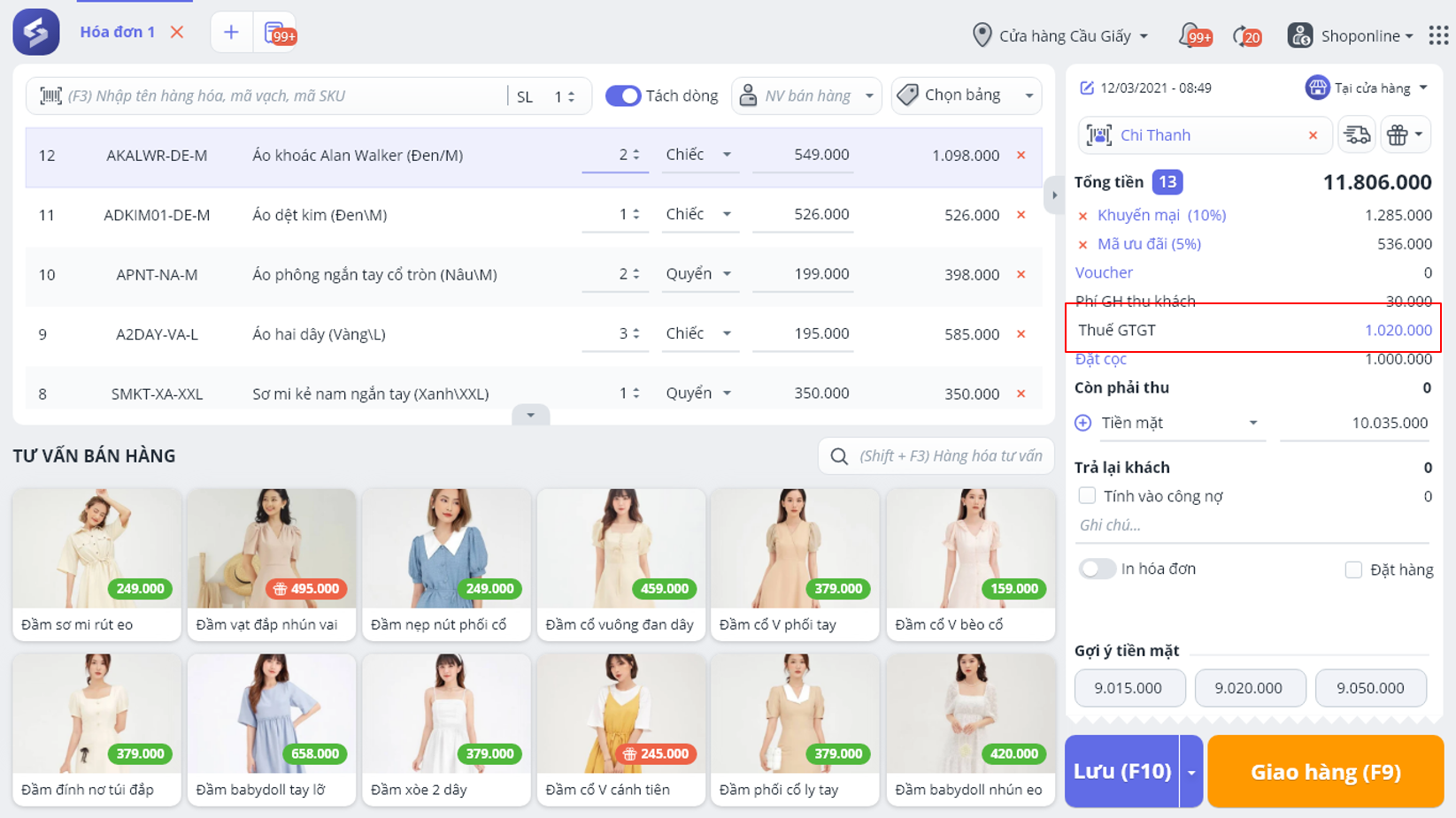 - Trên màn hình bán hàng luôn hiển thị tiền Thuế GTGT như hình dưới đây.