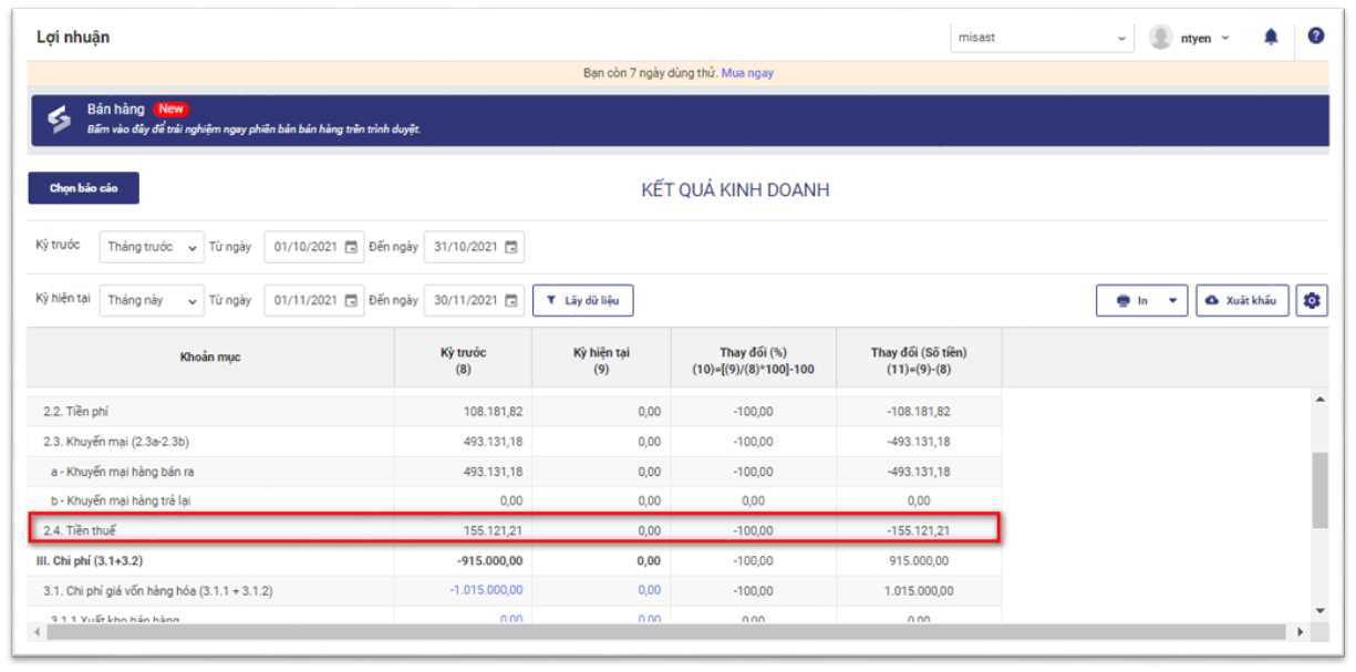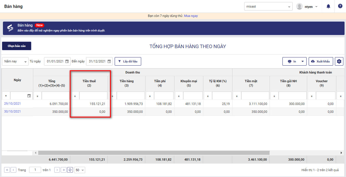 Toàn bộ báo cáo bán hàng sẽ hiển thị chi tiết tiền thuế GTGT trên hóa đơn trong kỳ