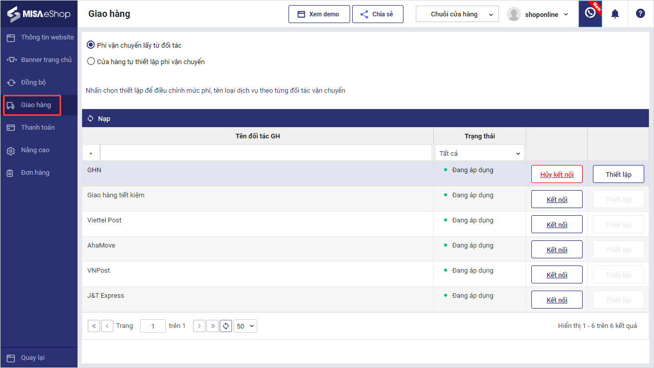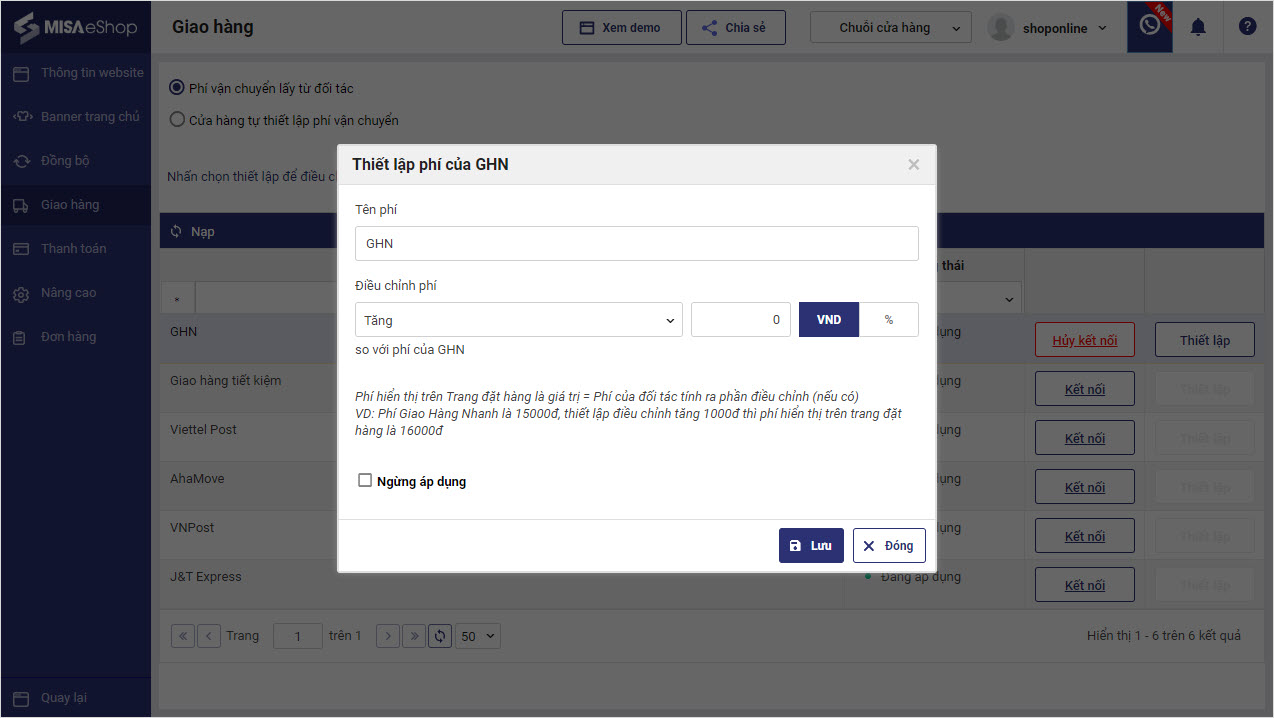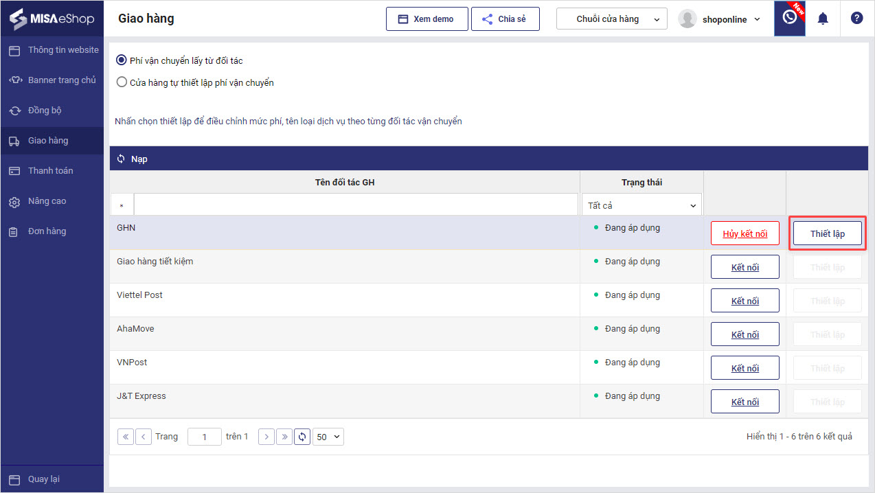 - Chọn Thiết lập để điều chỉnh mức phí, tên loại dịch vụ theo từng đối tác vận chuyển.