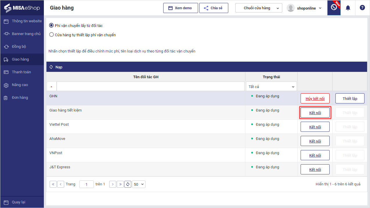 - Nhấn Kết nối với đơn vị vận chuyển phù hợp.