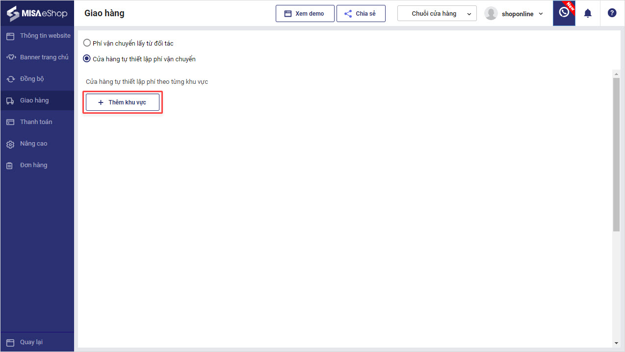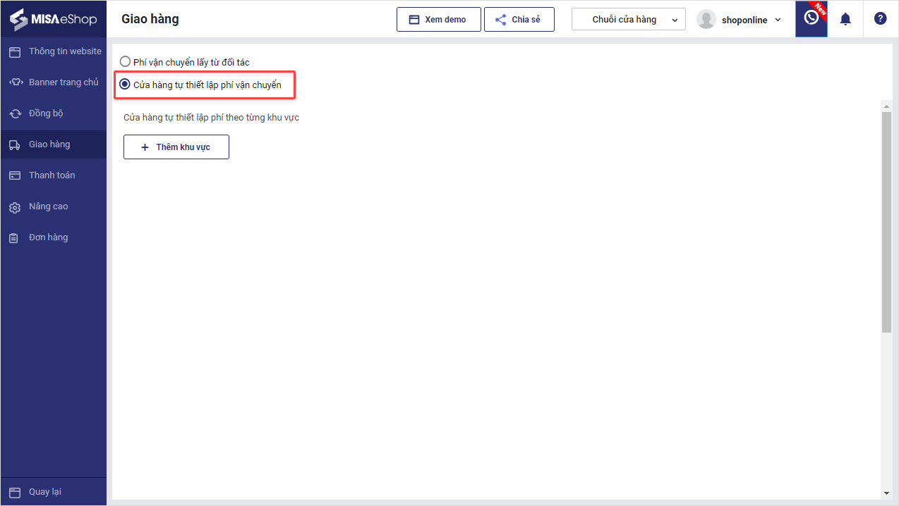 TH2: Cửa hàng tự giao hàng và thiết lập mức phí riêng.