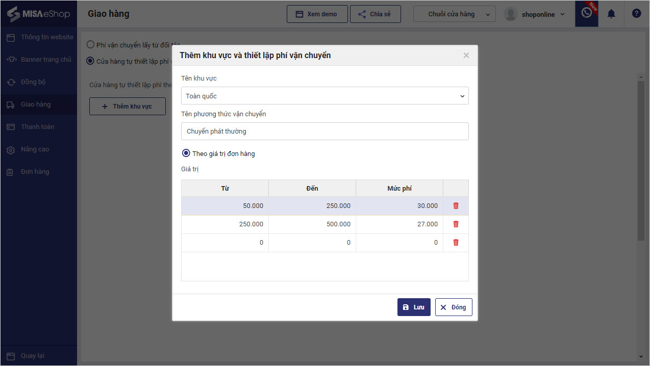 - Trong trường hợp cửa hàng áp dụng phí vận chuyển riêng theo giá trị đơn hàng, nhập giá trị đơn hàng và mức phí vào ô tương ứng.