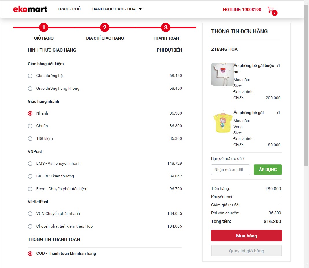 - Sau khi thiết lập hình thức giao hàng qua đối tác, khi khách thực hiện đặt hàng, chương trình sẽ đưa ra mức phí tạm tính cho từng hình thức giao hàng của đối tác.