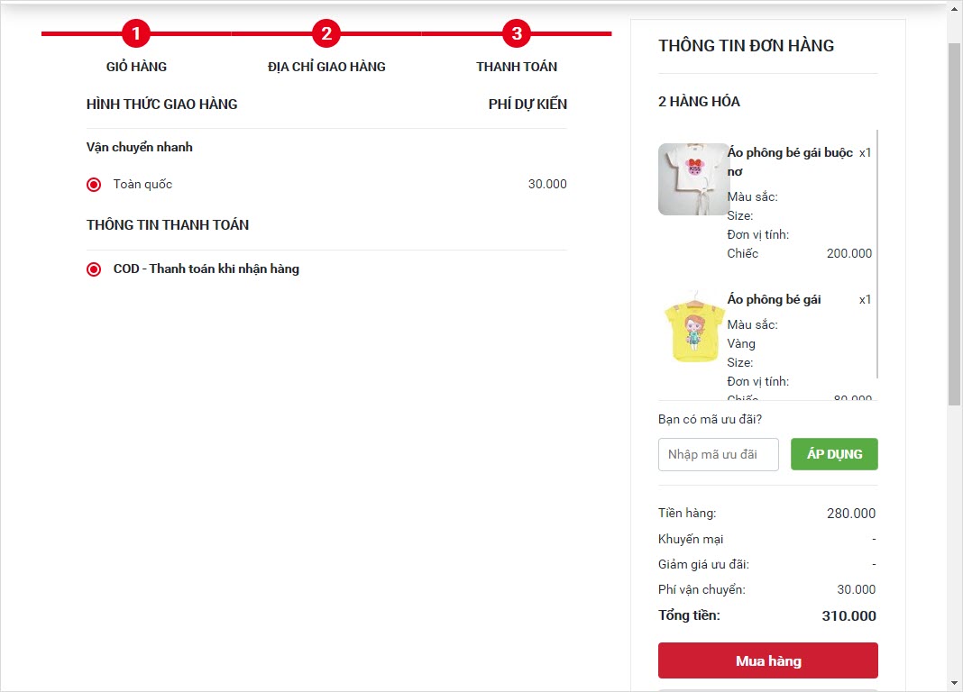 - Sau khi thiết lập Trang đặt hàng hiển thị như sau: