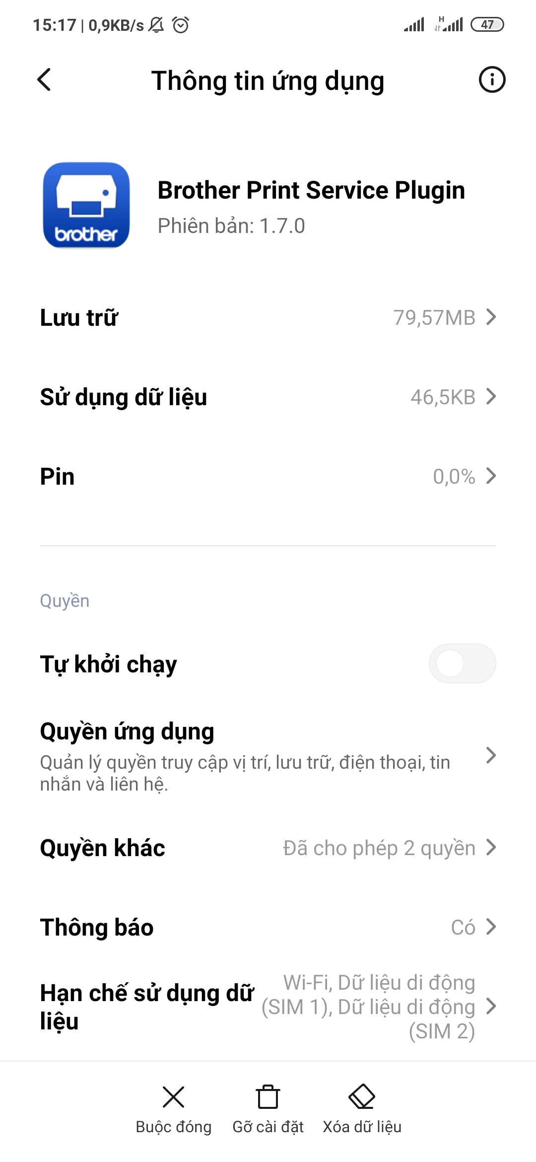 • Chọn Brother Print Service Plugin\ Quyền ứng dụng.
