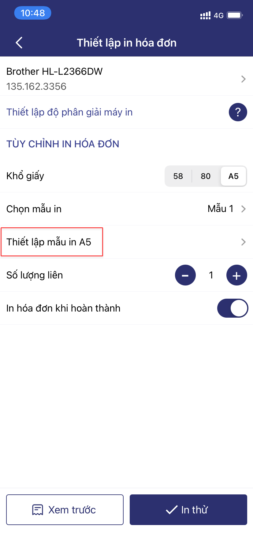 Lưu ý: Khi thiết lập in trên khổ giấy A5, cửa hàng không cần nhập IP máy in.