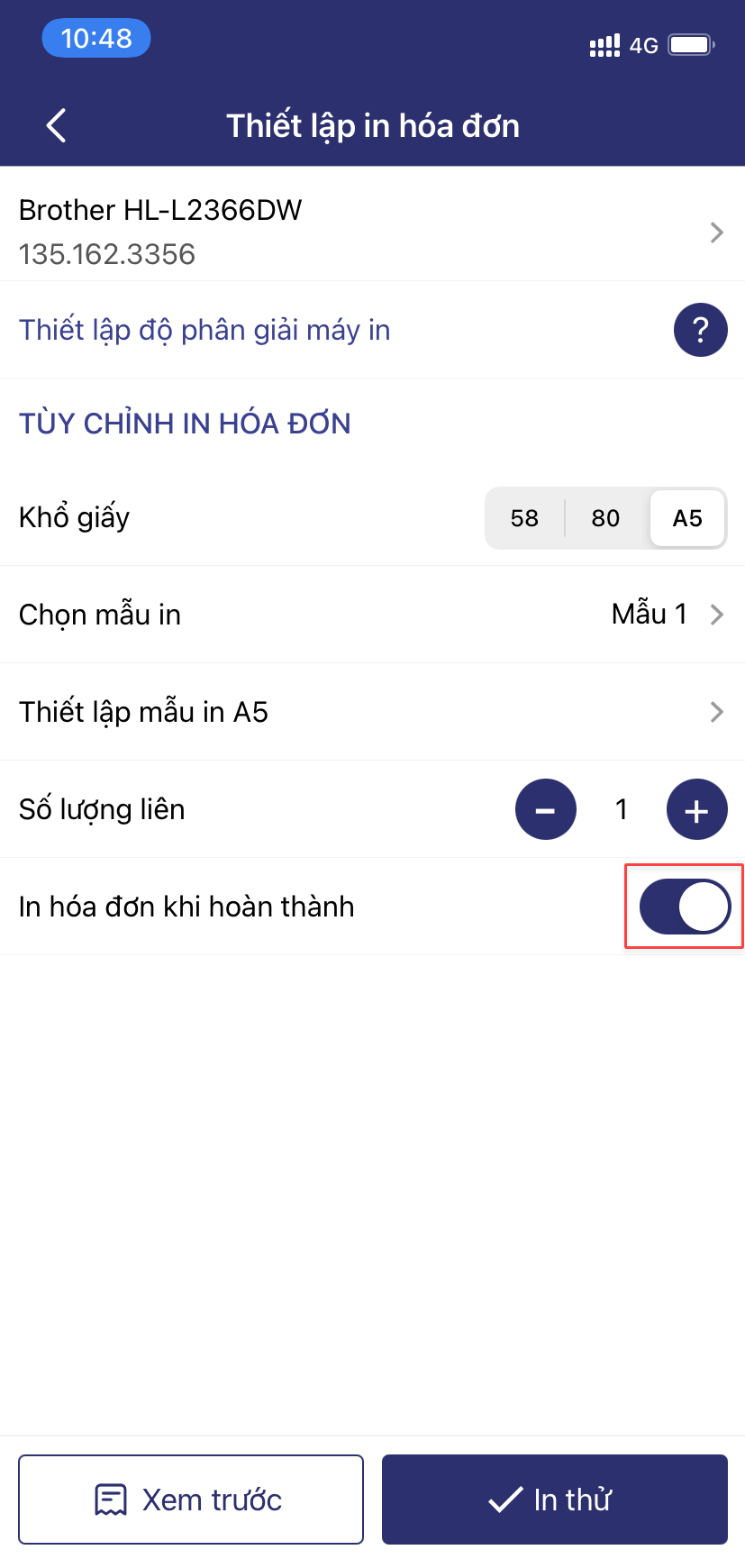 Lưu ý: Trong trường hợp cửa hàng muốn tự động in hóa đơn khi hoàn thành, quản lý thực hiện bật ON tính năng này.