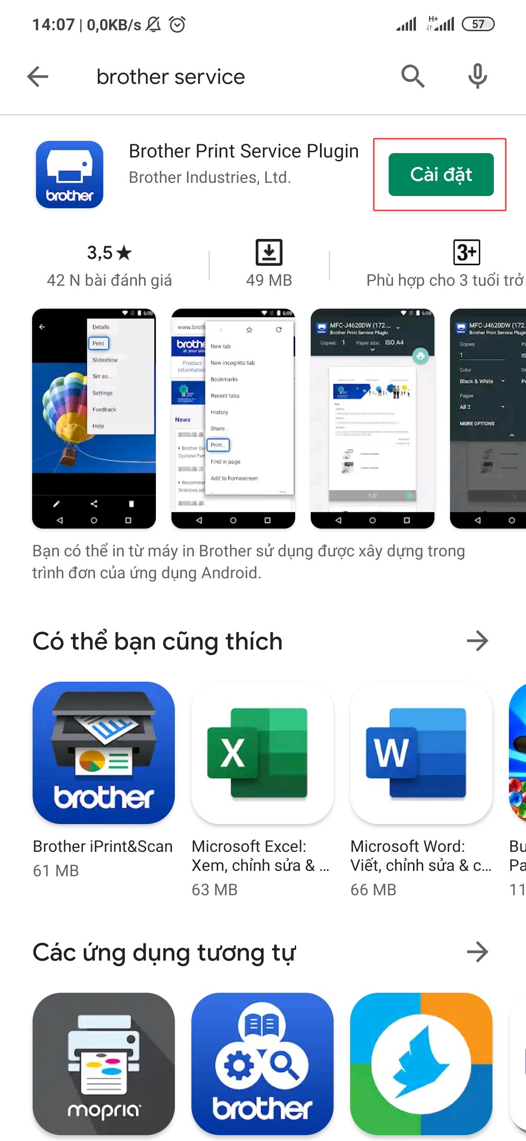 • Vào CH Play, nhập Brother Print Service Plugin, nhấn Cài đặt.