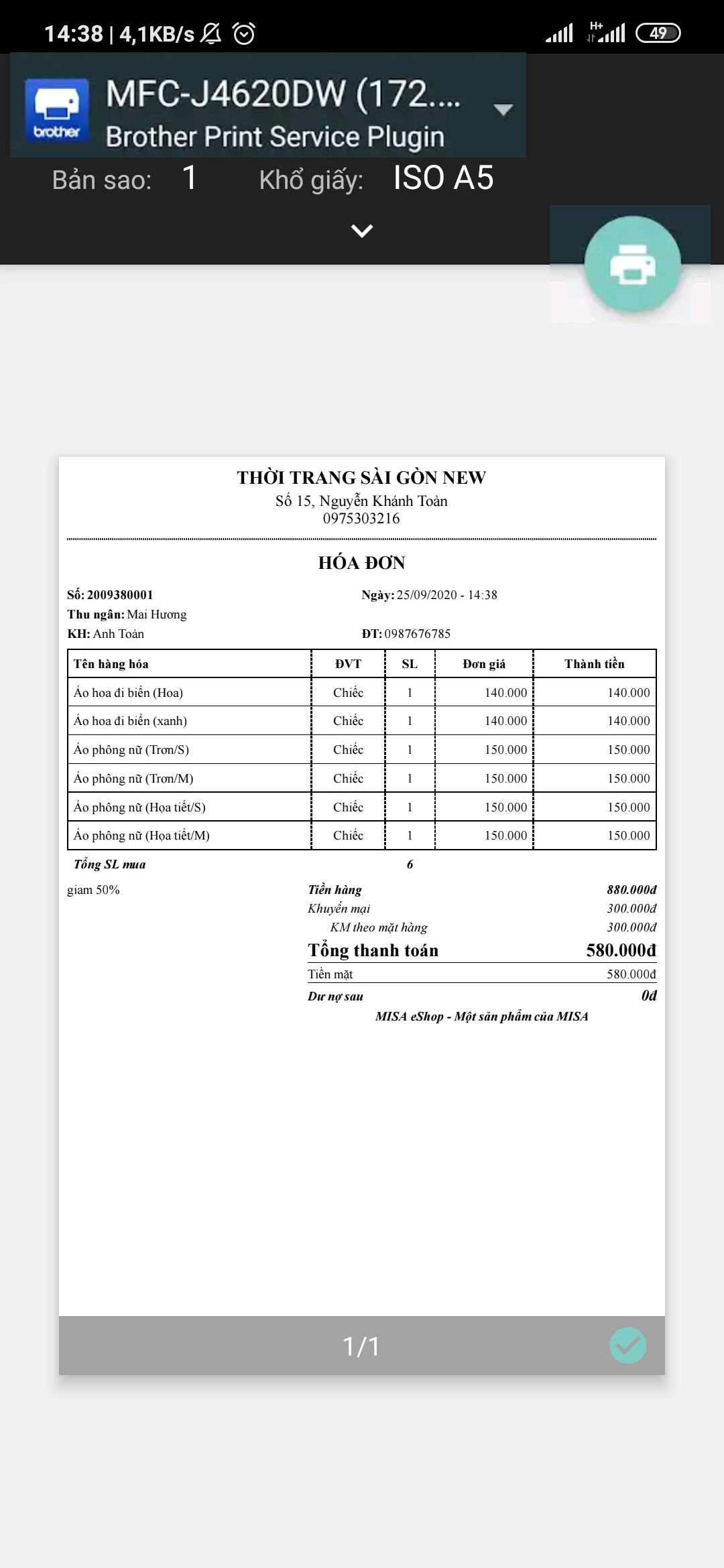 MISA eShop cập nhật tính năng in qua App Bán hàng, cửa hàng có thể lựa chọn in trên máy in khổ giấy 58, 80, A5.