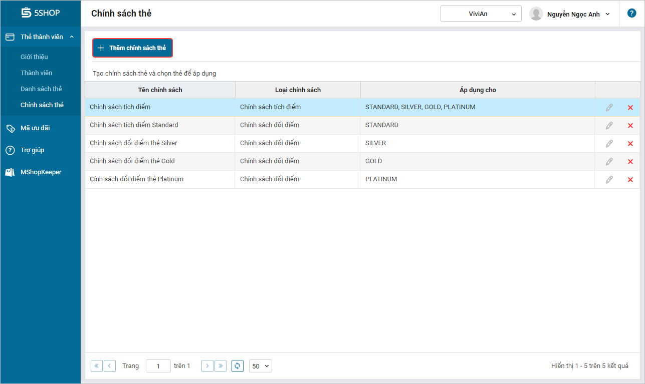 1. Nhấn chọn Thẻ thành viên\Chính sách thẻ.