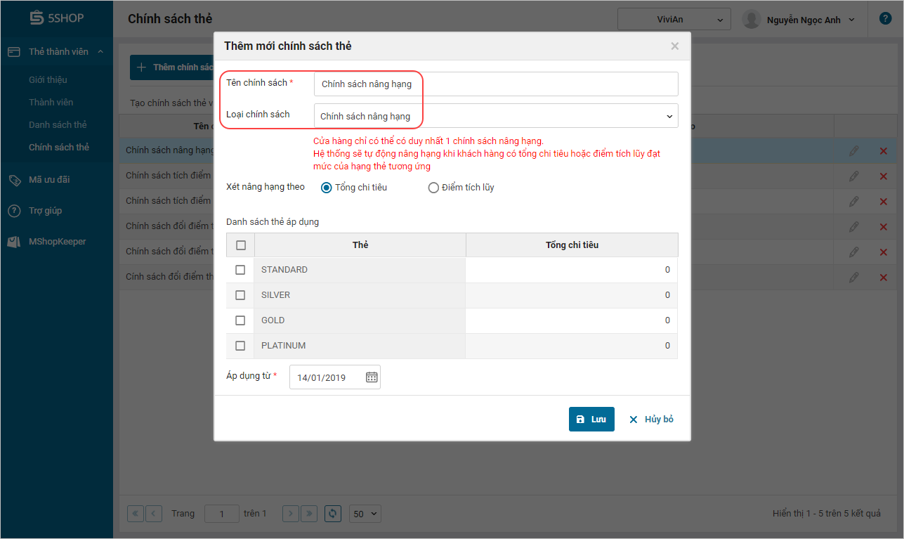 1. Cửa hàng chỉ có thể tạo được 1 chính sách nâng hạng duy nhất.