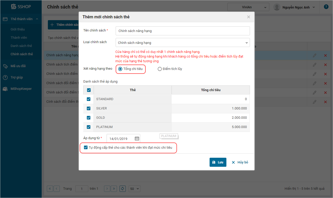 5. Chọn tiêu chí Xét nâng hạng theo Tổng chi tiêu (số tiền khách chi tiêu) hoặc theo Điểm tích lũy. Khi khách đạt được mức doanh thu/điểm tích lũy, hạng thẻ sẽ tự động được nâng.