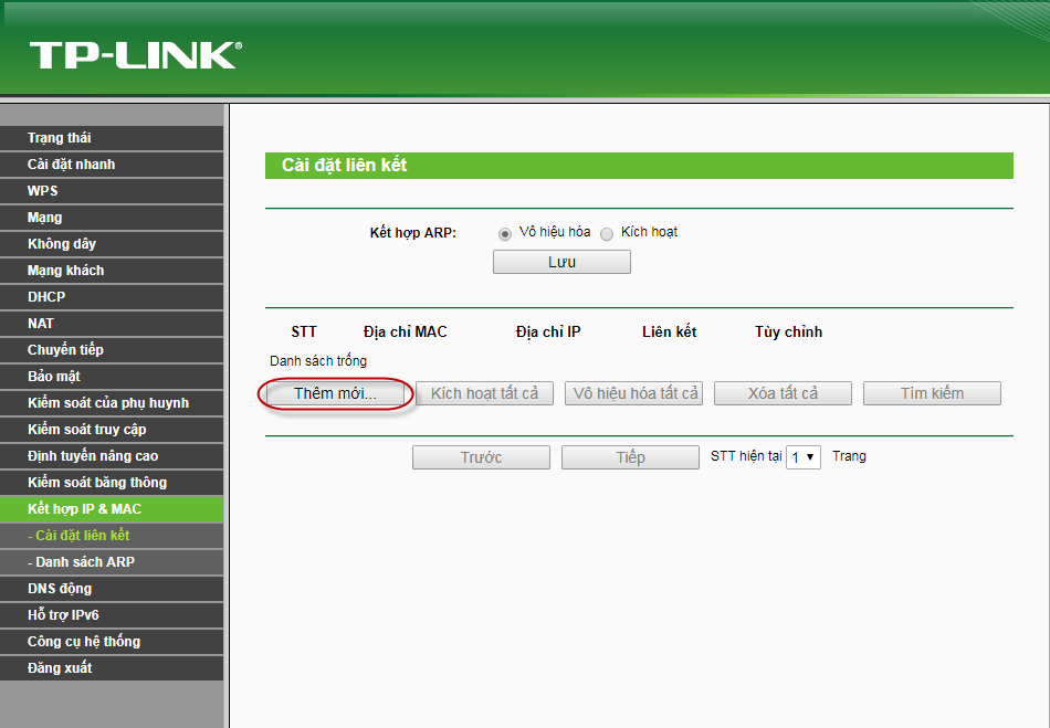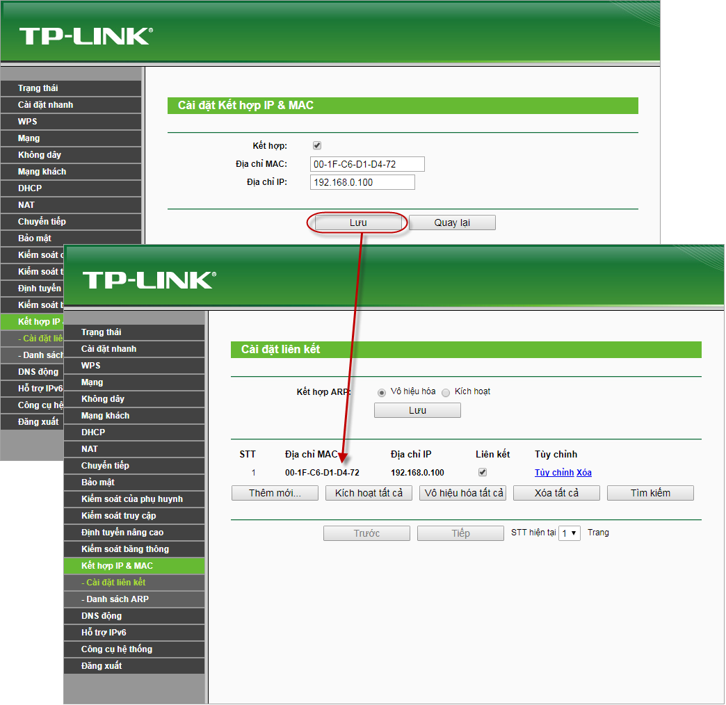 - Nhấn Kết hợp IP & MAC, chọn Cài đặt liên kết.