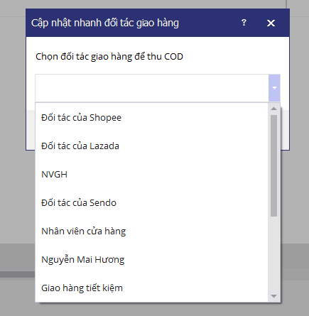 Khi Thu ngân chọn Thu COD đơn giao hàng từ đối tác vận chuyển, tuy nhiên vì một lý do nào đó nên đơn không có đối tác vận chuyển (Ví dụ: Lỗi dữ liệu, lỗi mạng, …). Trong trường hợp này, khi nhấn Thu COD, chương trình sẽ hiển thị màn hình yêu cầu cập nhật lại đối tác vận chuyển.