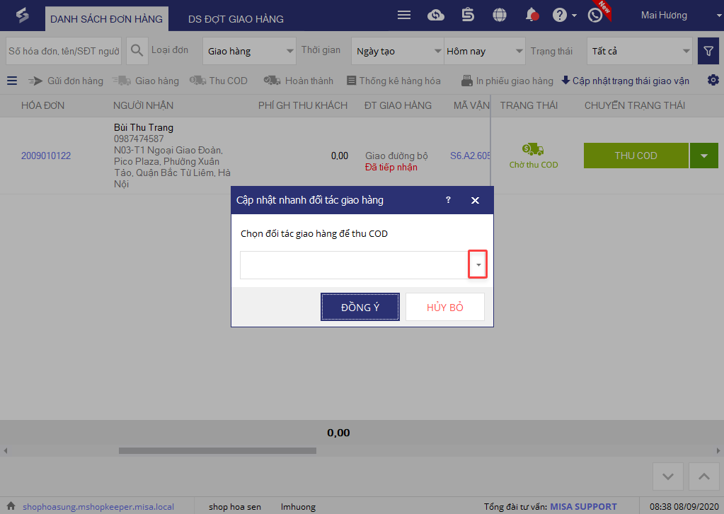 Tương tự, việc xử lý Thu COD của đơn trên trang quản lý cũng yêu cầu cập nhật đối tác vận chuyển nếu đơn chưa có thông tin Đối tác vận chuyển.