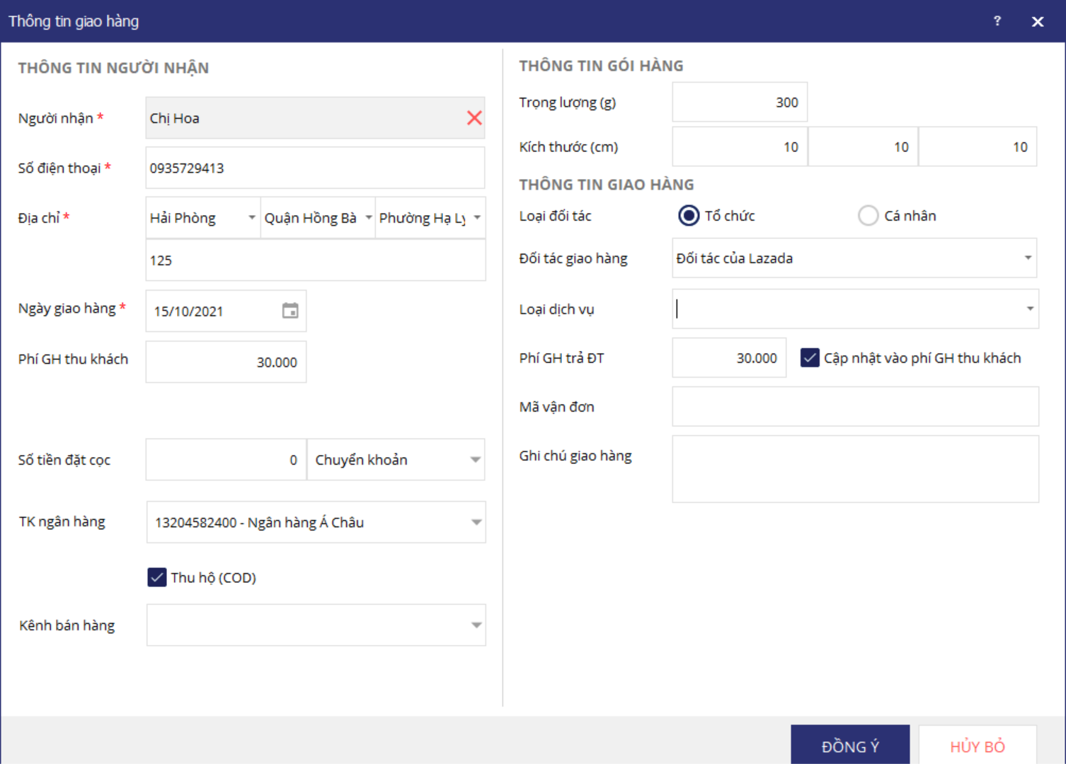 - Trường hợp đối tác giao hàng thu tiền khách rồi chuyển về cho cửa hàng, tích chọn thông tin Thu hộ (COD).