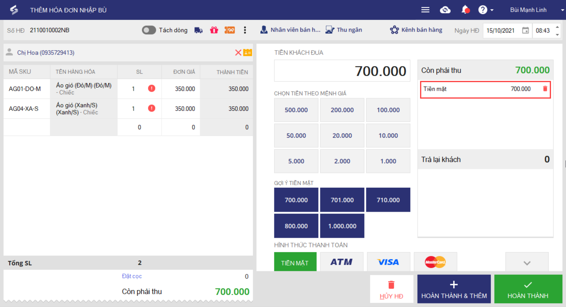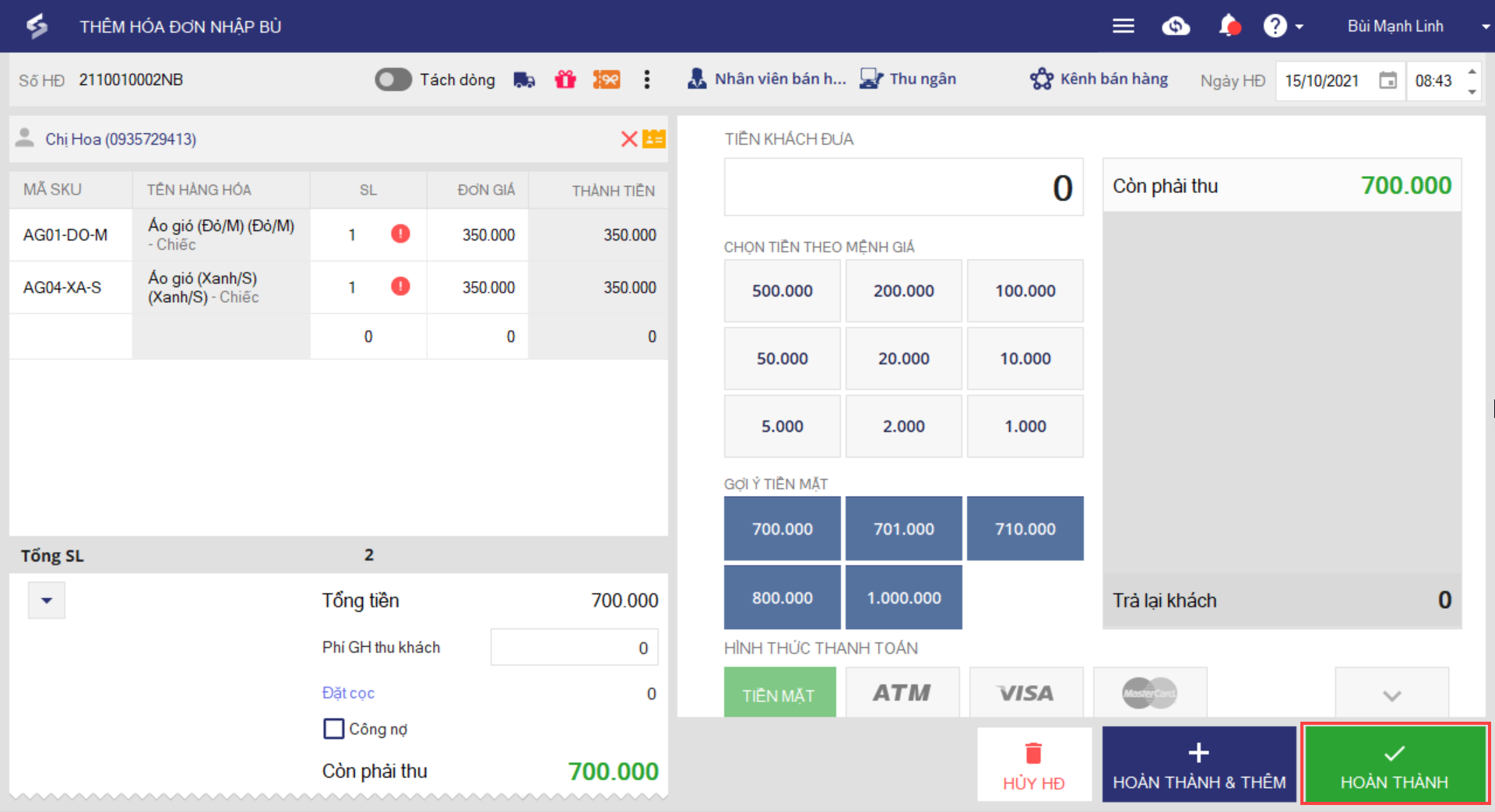 để ghi nhận - Nhập số tiền khách thanh toán và chọn hình thức thanh toán tương ứng.
