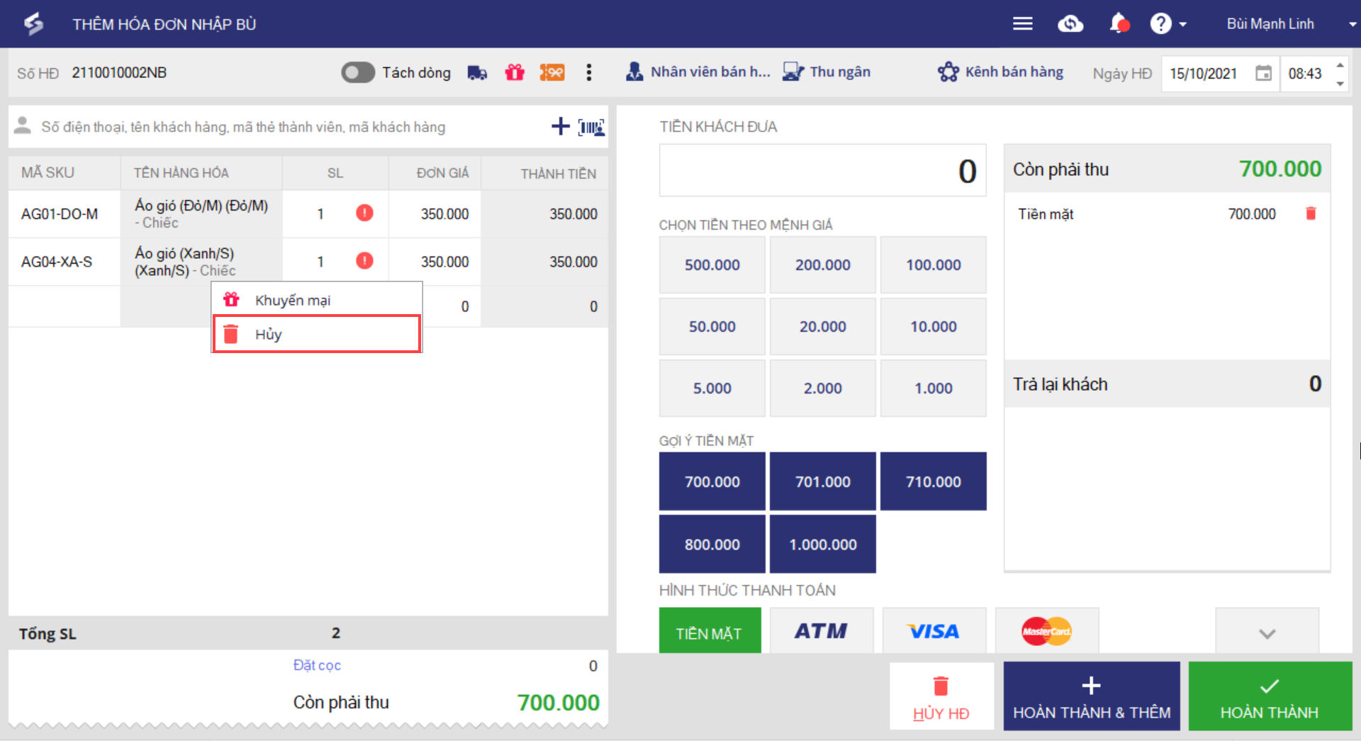 Trong trường hợp chọn sai hàng hóa, nhấn chuột phải vào thông tin hàng hóa và chọn Hủy.