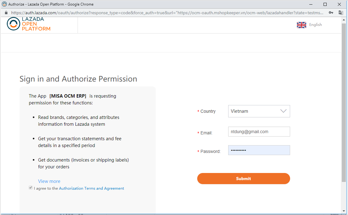 Bước 2: Nhập thông tin tài khoản đã đăng ký trên Lazada để kết nối với OCM.