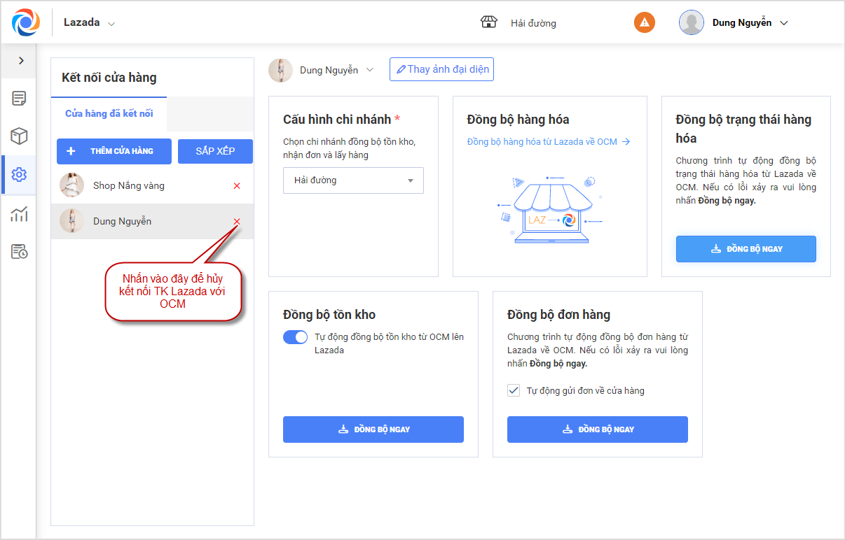 để hủy kết nối giữa tài khoản Lazada với OCM.
