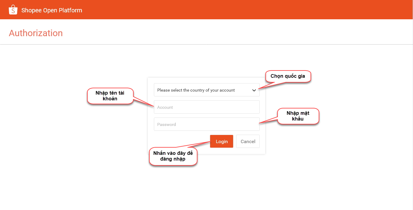 Bước 2: Điền thông tin tài khoản đã đăng ký trên shopee để kết nối với OCM.