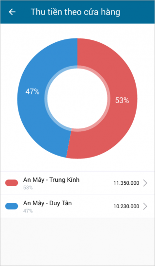 - Nhấn chọn thông tin Tiền thu/Tiền chi/Chênh lệch để xem tỷ trọng tiền thu giữa các cửa hàng trong chuỗi.