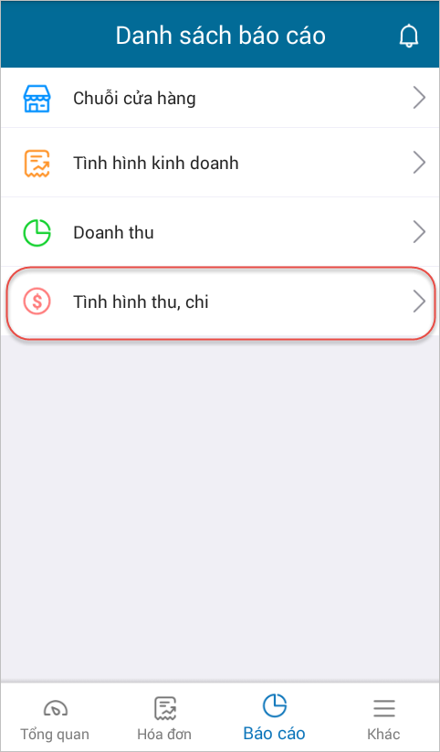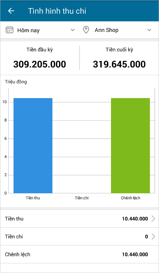 Quản lý cửa hàng có thể theo dõi tình hình thu chi tiền mặt, tiền gửi của cửa hàng trên ứng dụng như sau: