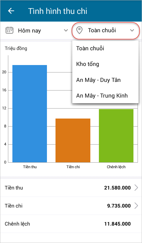- Trường hợp cửa hàng hoạt động theo mô hình dạng chuỗi, nhấn Toàn chuỗi để xem tình hình thu chi của toàn chuỗi hoặc các riêng từng cửa hàng trong chuỗi.