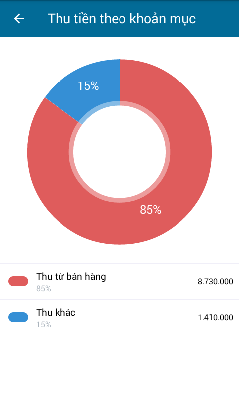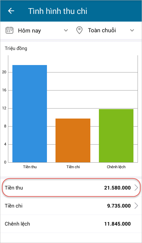 - Hoặc nhấn vào các khoản Tiền thu, Tiền chi, Chênh lệch để xem chi tiết theo từng khoản thu.
