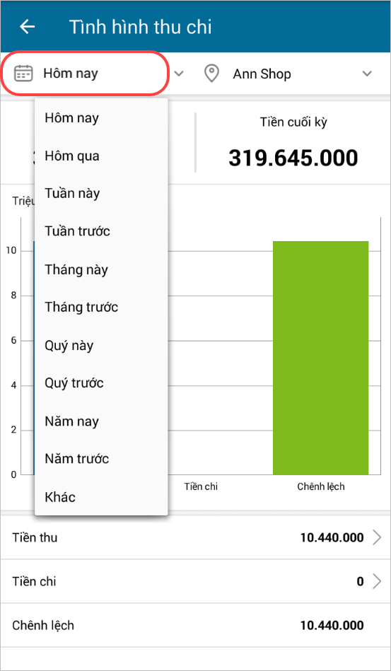- Nhấn vào thông tin thời gian để xem báo cáo tình hình thu chi ngày hôm trước hoặc theo tuần/tháng/quý/năm.