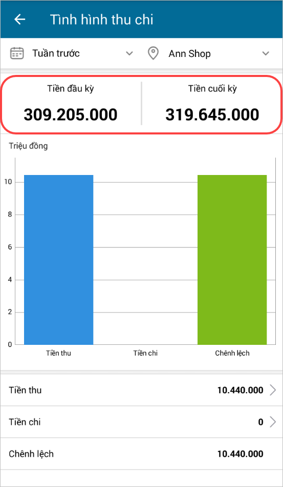 - Xem thông tin số Tiền đầu kỳ, Tiền cuối kỳ tại cửa hàng.