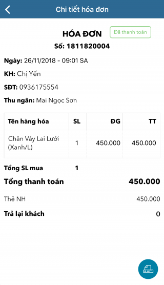 Trường hợp cửa hàng thiết lập máy in, nhấn biểu tượng để thực hiện in lại hóa đơn cho khách.